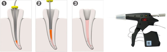 専用の機器(スーパーエンドベータ)で薬剤を加熱し流動化させ、STEP1で根尖をふさいだ根管に薬剤を流し込みます。